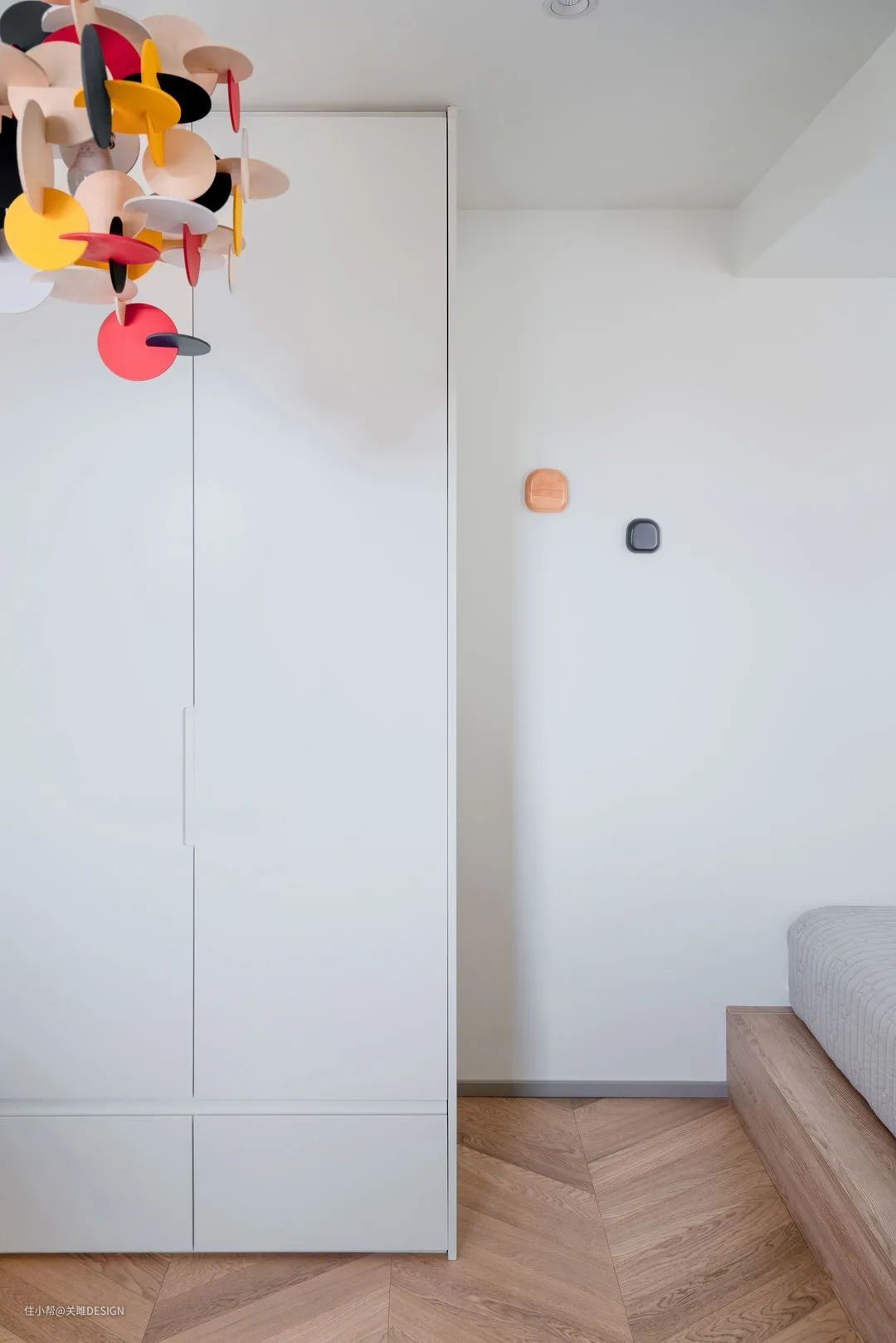 将原有书房纳入儿童房,让使用空间更大一些。考虑到小朋友不同年龄段的需求,采用留白设计手法,为后期改造提供了更加弹性可变的空间。儿童房衣柜下方,设置了较大的抽屉,方便小朋友日自己进行简单的收纳整理。