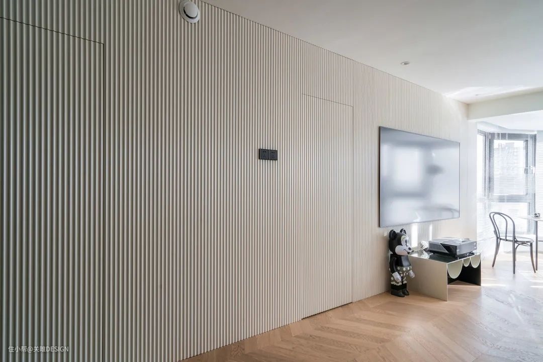 客厅沿着电视墙一侧,做了一整面的格栅木饰面,同时将卫生间和厨房隐藏其中,消除了门框对空间的分割视觉感,让空间更显整洁统一,视觉效果更宽敞大气。