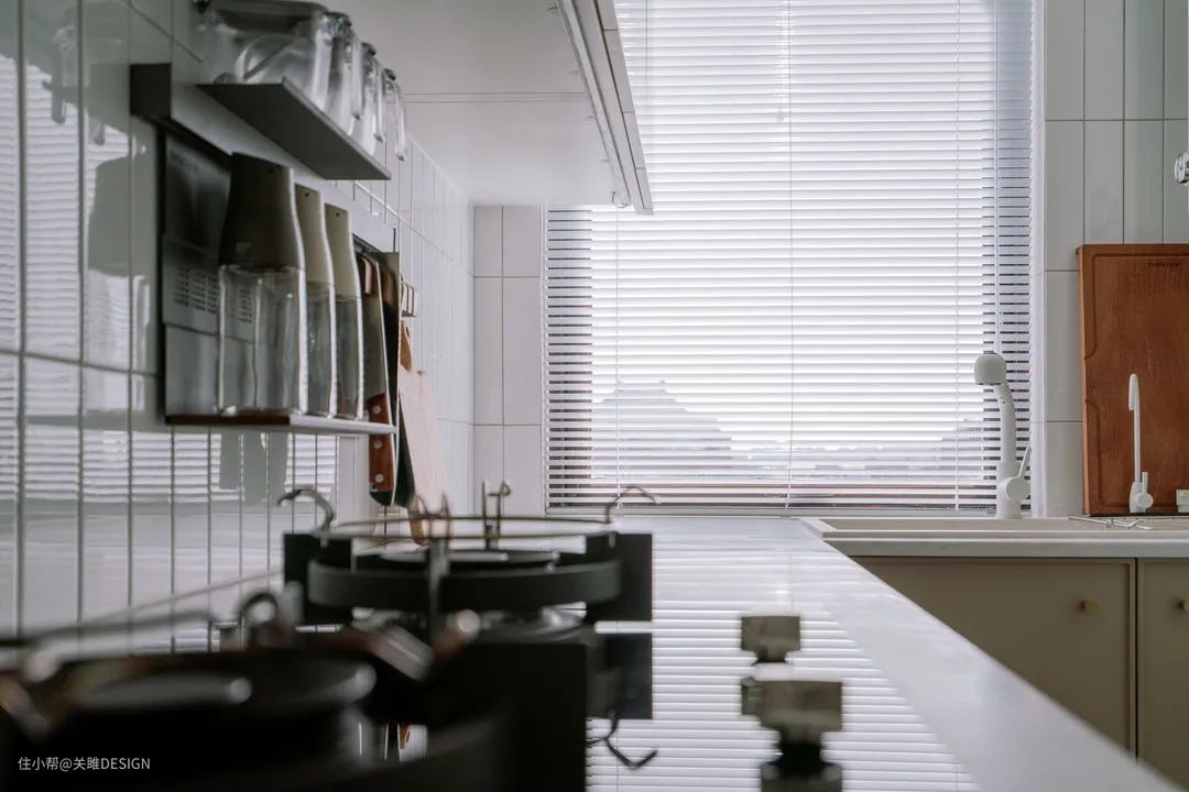 厨房空间虽小,功能一样不少。温柔的奶油色,搭配纯净的白色,简单干净。墙面安装了置物架,各种物件收纳在墙面,维持整个厨房操作台的整洁,看着舒心,用着顺心。