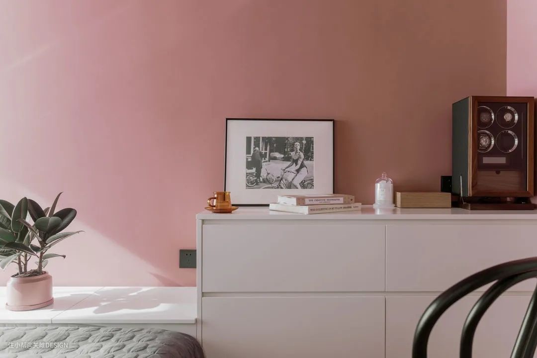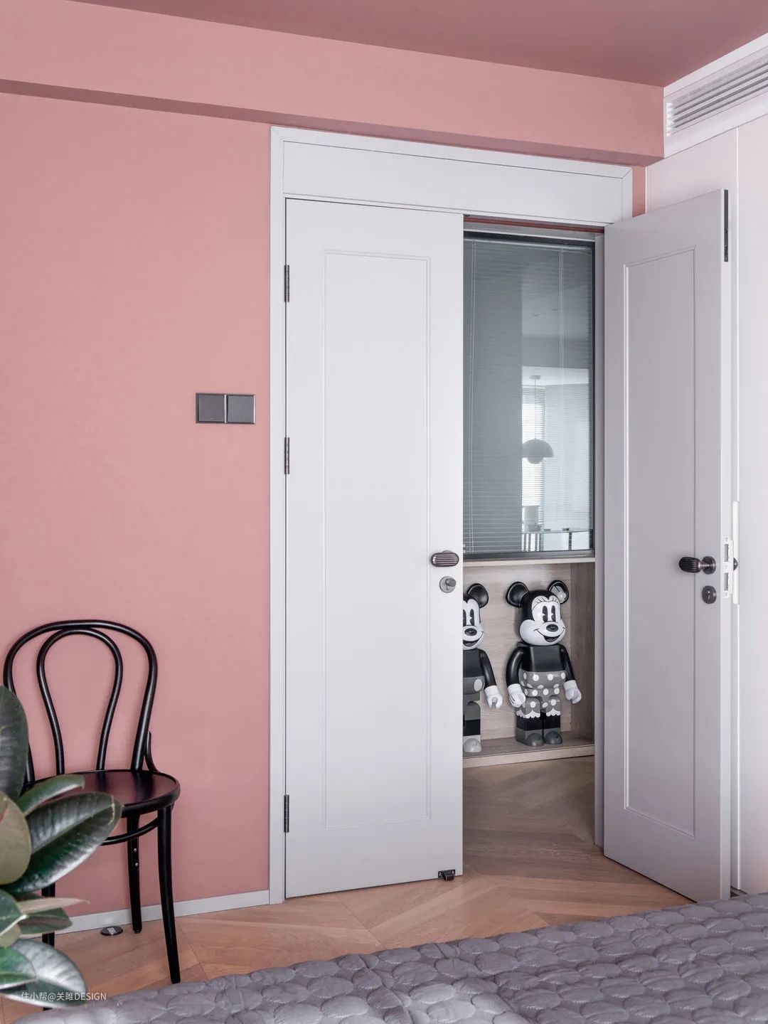 由于户型是单面采光,于是将主卧门,调整为双开门设计,作为走廊的补充采光。粉色与白色的结合,让整个空间都透着甜蜜感。木地板由客厅一直通铺到卧室,没有过门石设计,效果整洁统一。