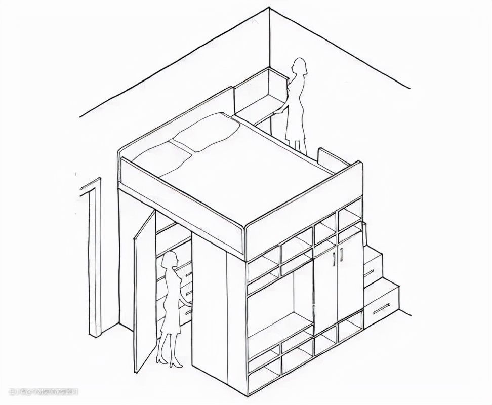 单独打造一个衣帽间在房价飙升的今天是很奢侈的,许多人家的户型是LOFT挑高小户型(卧室层高>3.8m),利用高度差打造衣帽间区域再好不过。