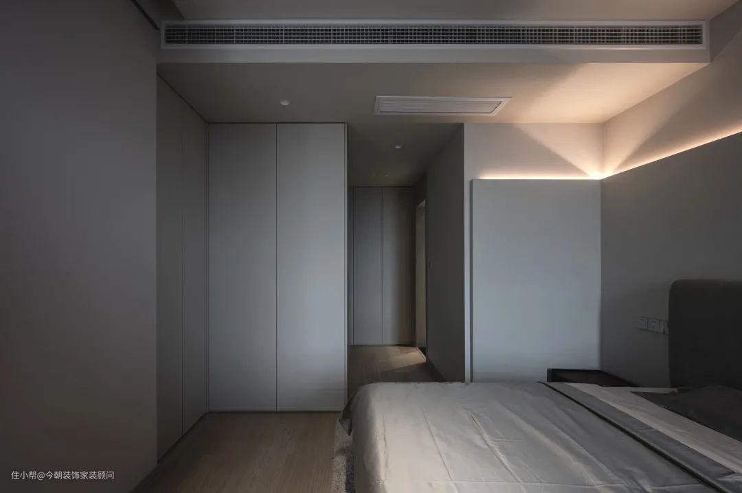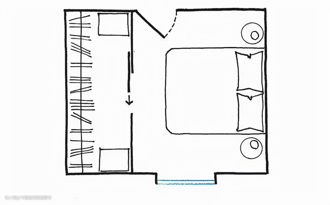 如果卧室不大,我们找到房间一角,利用“L形”布局和床头,拼出一个三角区域,卧室衣帽间就诞生了。