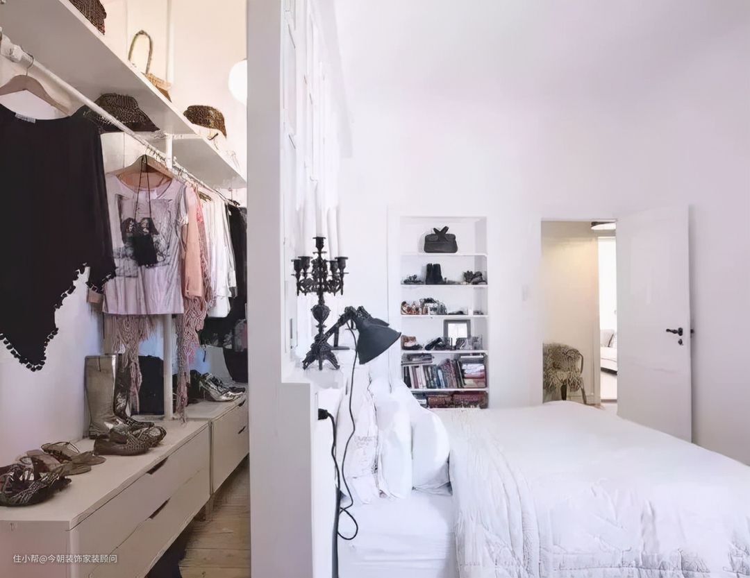 如果嫌麻烦,可以不用做隔墙,床头本身就可以当成隔断,这种不完全封闭的衣帽间,在光线不错的情况下,还能把衣帽间作为展示区域。