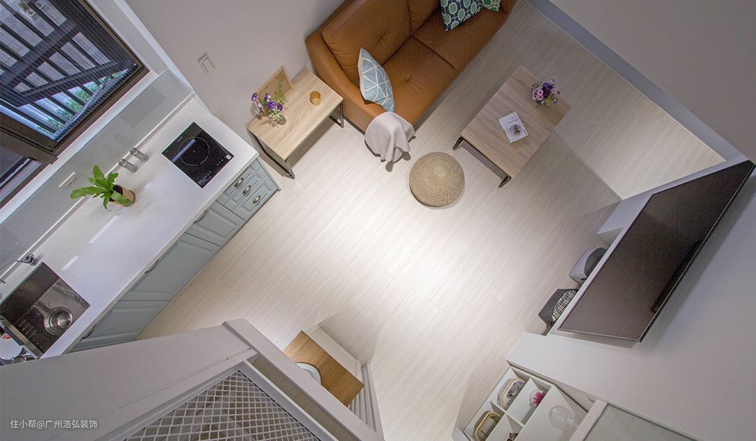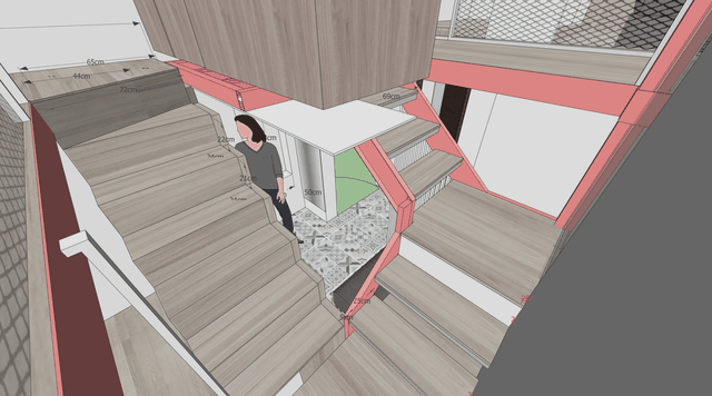 由于一支横卧结构大樑,将室内一分为二,更压迫原先不大的坪数,为了保有局部挑空视野,决定利用过樑闢筑楼梯,使上层可应用的空间不受压缩,佈局出下层一房+上层两房格局,更以单梯衔接两边寝室,藉此减少动线佔据的配比,大幅增扩活动范围。