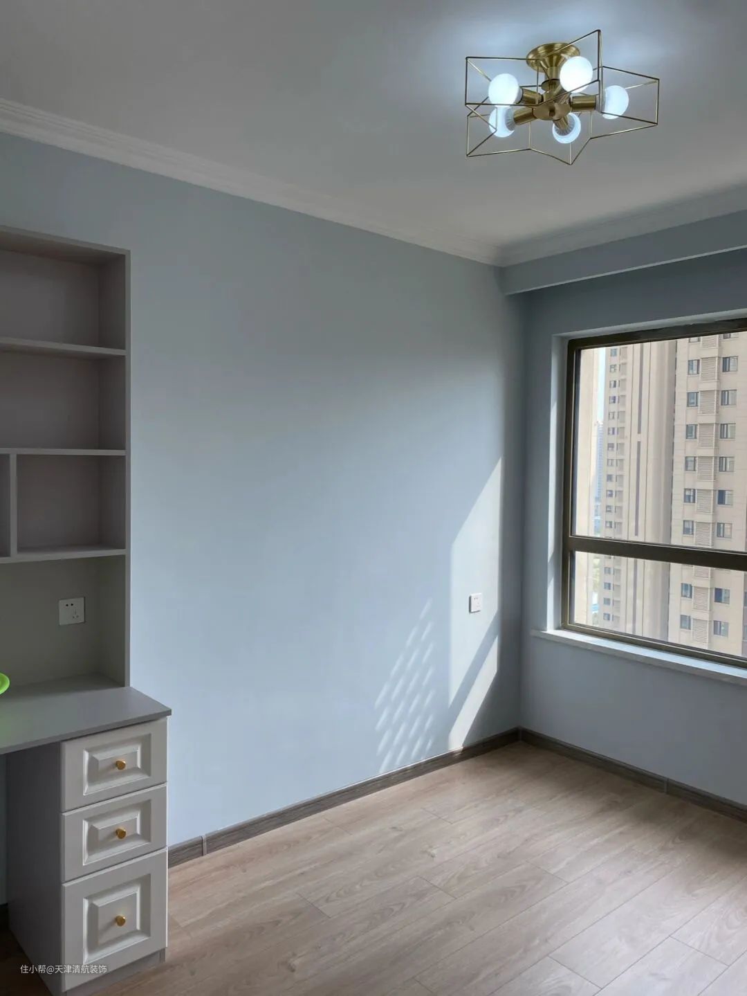 儿童房的墙壁也刷成了蓝色,旁边定制了一个非常实用的书桌柜,方便家里的孩子写作业或者看书。到时候会安排一张床,基本没有多余的空间。我没有选择安装吊顶,只是走了一圈石膏线条,而是做了窗帘盒,简单美观,没有层次感就不会出现。地面的木地板更暖和更舒适。尤其是阳光普照的时候,真暖和!