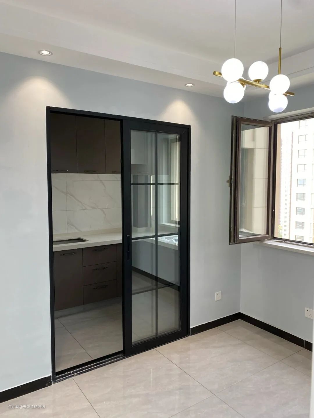 厨房左侧的入口是厨房,有一扇黑色边框的推拉门,价值很高,也是很多人喜欢的风格。安装了透明玻璃门,可以透过玻璃看到厨房内部,让空间更加宽敞通透。