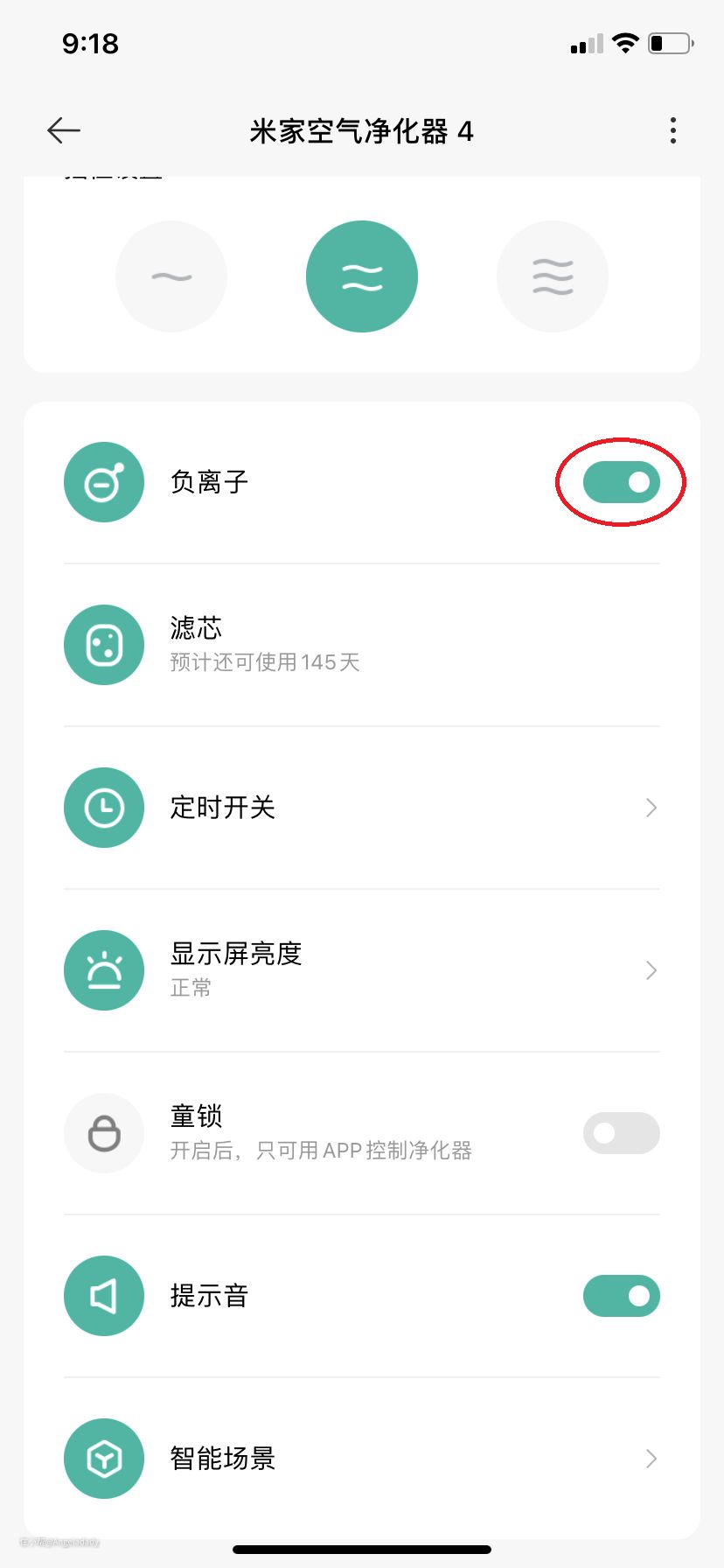 ▲米家APP中不仅可以实时显示空气质量、滤芯寿命、负离子开关,并且有多档位可选择,更有定时开关、显示屏亮度可关,智能场景可私人定制,即使远在公司,也能实时操作,非常的方便。