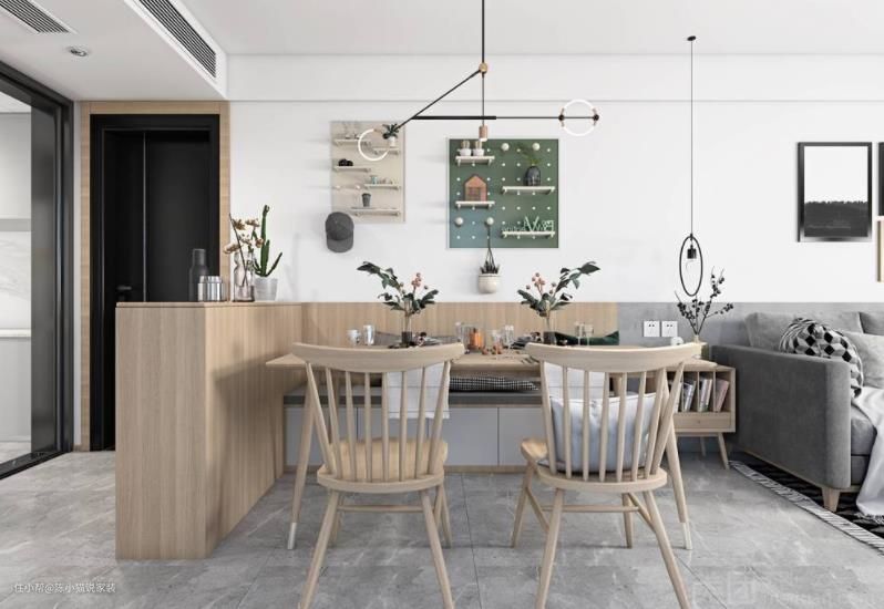 如果餐厅真的很小,只有1平米左右的话,那么通过转角卡座的设计,也能让2-3人同时用餐,夫妻两人+一个孩子,是足够的。