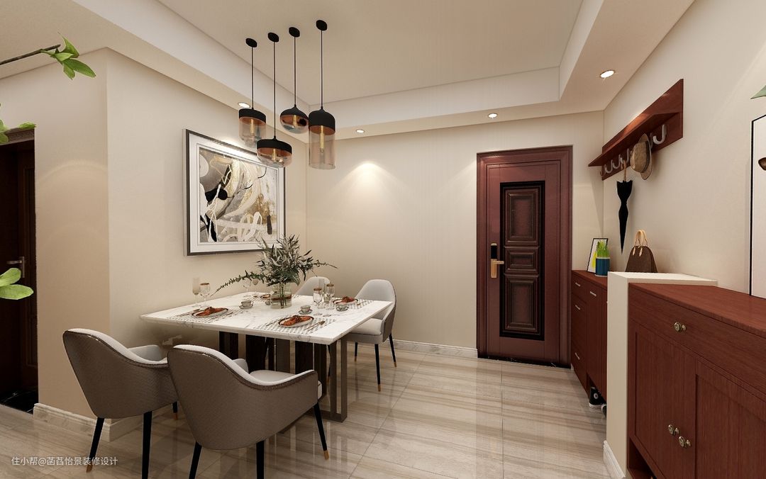 餐厅在入户的一侧,与门框同色系的玄关柜与餐边柜都是半墙的高度,在精致中透露着少许的古典氛围感。