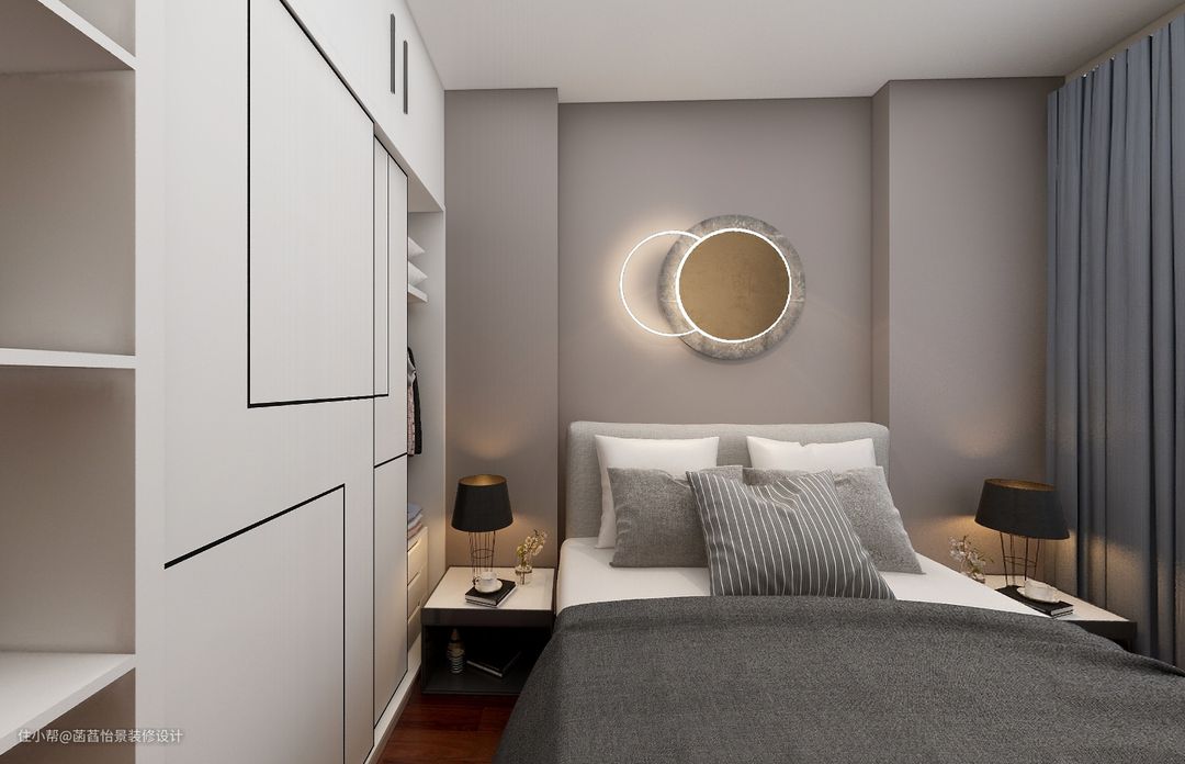次卧面积也不算小,与电视背景墙一样,挖深3cm厚的背景墙,将床头嵌入其中,形成统一,两侧的台灯与床头的装饰灯,散发着温暖的光芒,照亮每一个深夜。