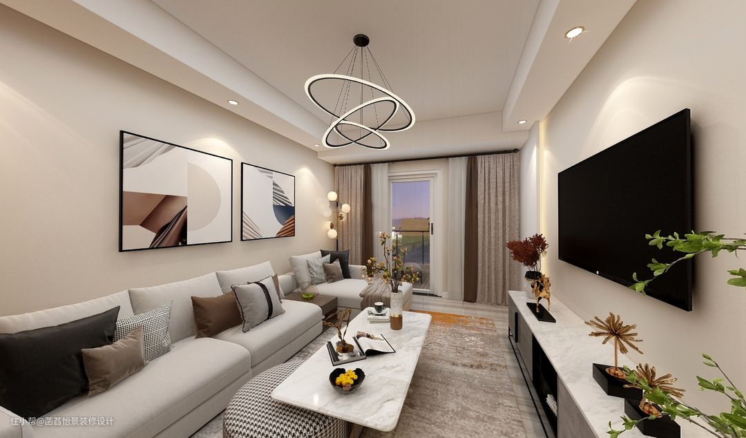 顶部黑边的环形交错的吊灯,白色大理石配上黑色柱脚的茶几,充满精致感。浅灰色沙发与奶咖色墙面,舒适加上色彩的跳跃,平衡的恰好,让整体不沉闷。