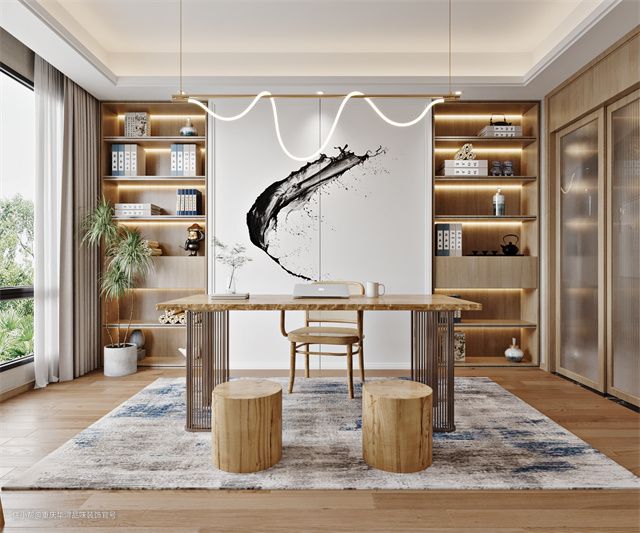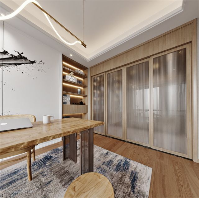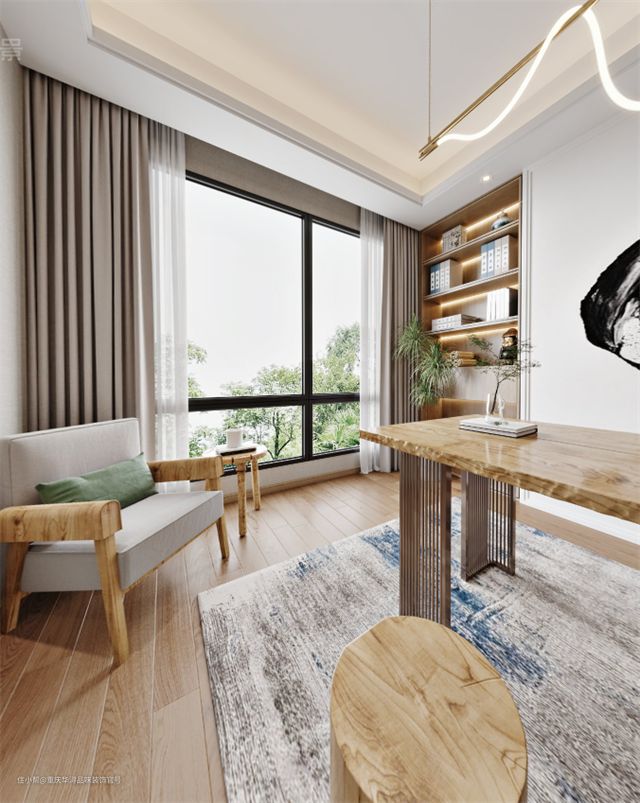 在厨房与次卧之间隔了一个书房,这里体现了一种简单、一种真正的平静。这个集工作、学习、阅读、休闲一体的多功能空间,非常适合居家办公。传统家具与设计感灯饰展现了空间独特艺术美感,营造了轻松氛围。