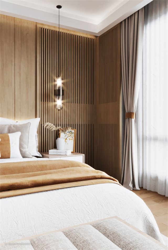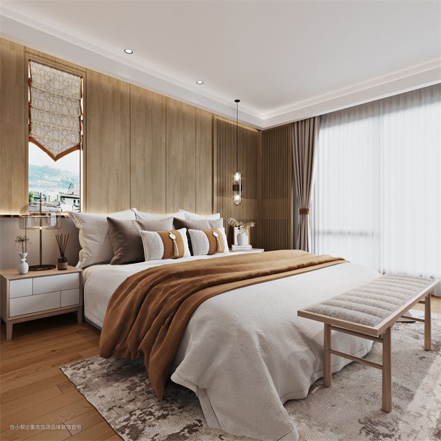 设计师为屋主规划了一个主卧+两个次卧。主卧没有做过多的修饰,床头背景与地板连通一体将床围合起来,让休息空间更有安全感。灯光以柔和的灯带为主光源,通过与床头背景的造型结合,来提供主卧空间的照明。次卧设计更为极简,搭配设计感灯饰,瞬间提升空间美感。
