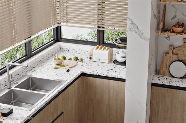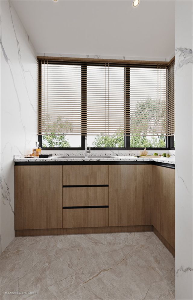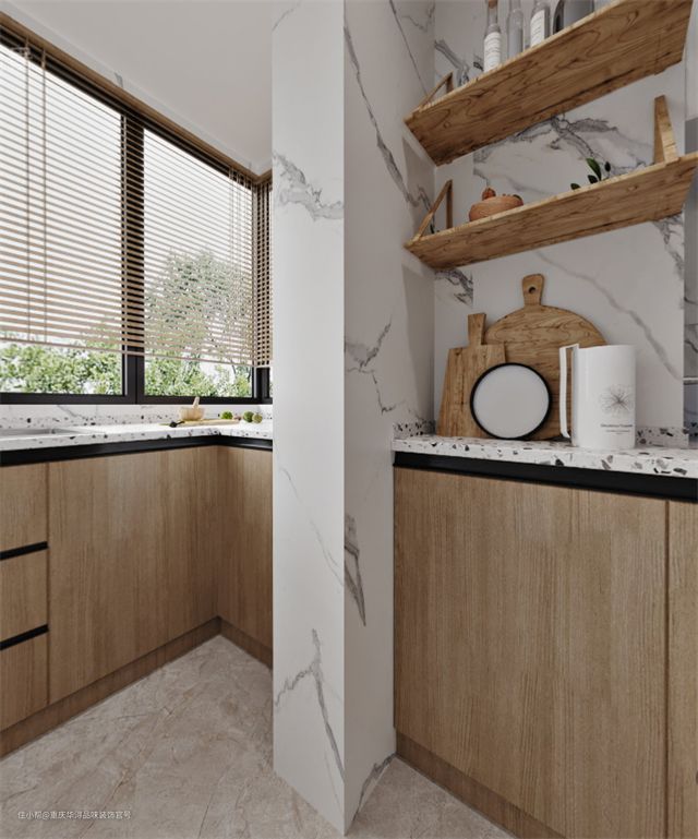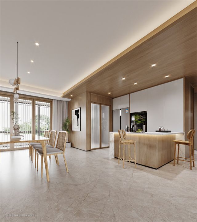 将厨房一分为2,既满足中厨的日常烹饪,同时也分割出一个西厨的功能区间。这样的格局将中厨隐藏了起来,不用担心油烟问题,并且通过西厨吧台与餐厅的联系,扩大餐厅的空间感,成为家人情感互动交流区。