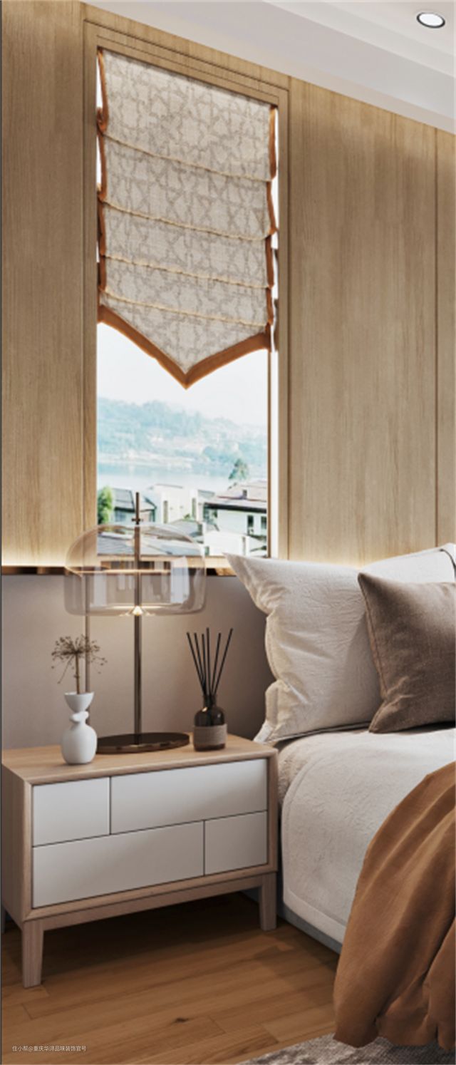 设计师选用极简浅色与原木色进行搭配,低饱和度暖色调,温馨舒适,很好地展现空间线条感与平面的简洁性。石材、屏风、绿植等元素的运用,加强不同空间的互通和联系。