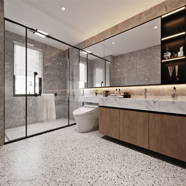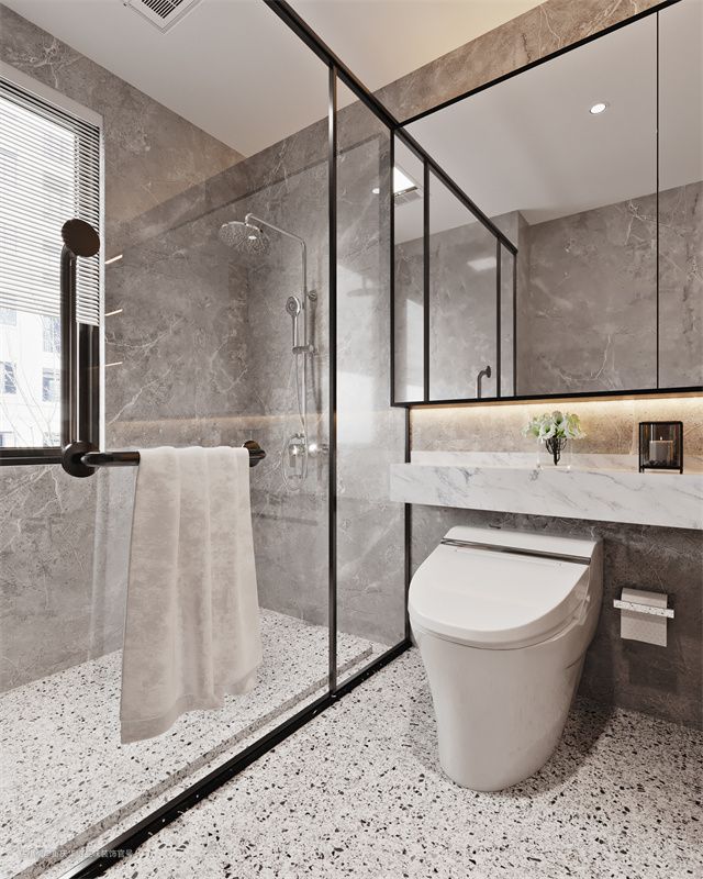 卫生间进行了简单的干湿分离,灰白质感瓷砖与原木材料结合搭配,质朴的肌理感最大限度地表达着居住者对自然美学的喜爱。主卫集洗漱区、淋浴区、泡澡区、如厕区,规整的设计处处体现精致细节。