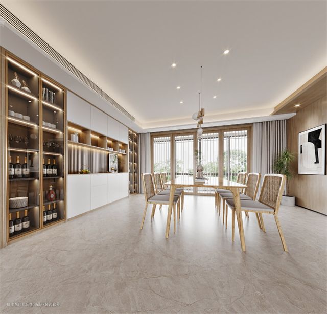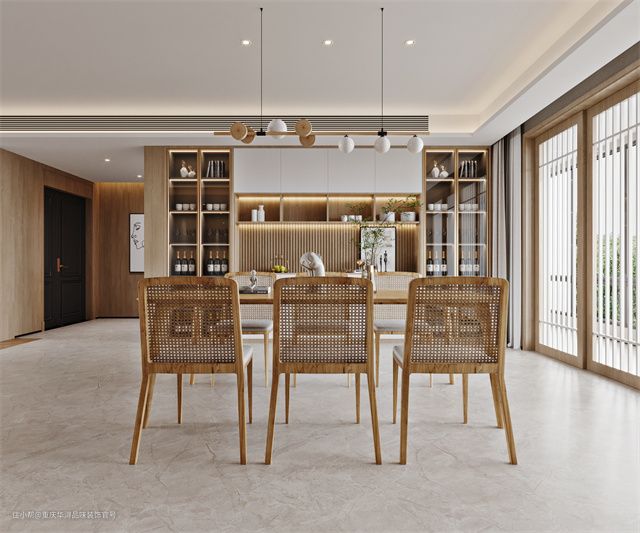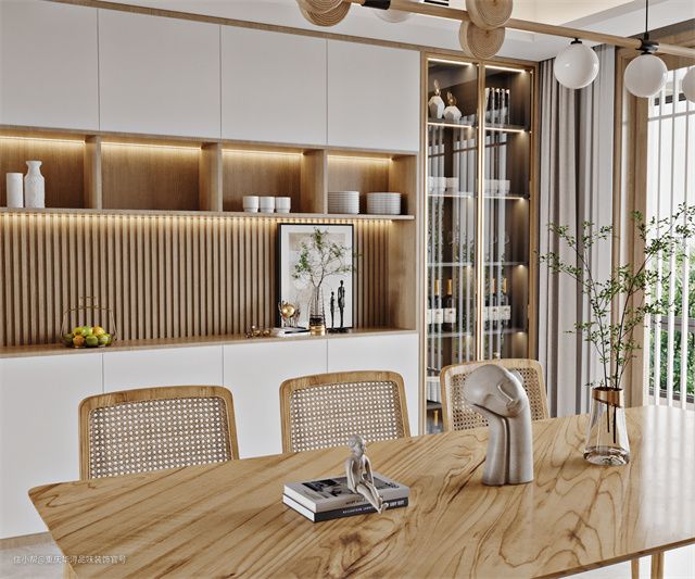 餐厅分布于客厅另一侧,与西厨吧台连为一体。餐厅与客厅以走廊形成虚拟隔断,两侧阳台丰富的自然采光进入室内,营造舒适的用餐体验。原木材质家具,简洁又实用。立面酒柜方便收藏美酒,适当摆放一些装饰品,更显美观。