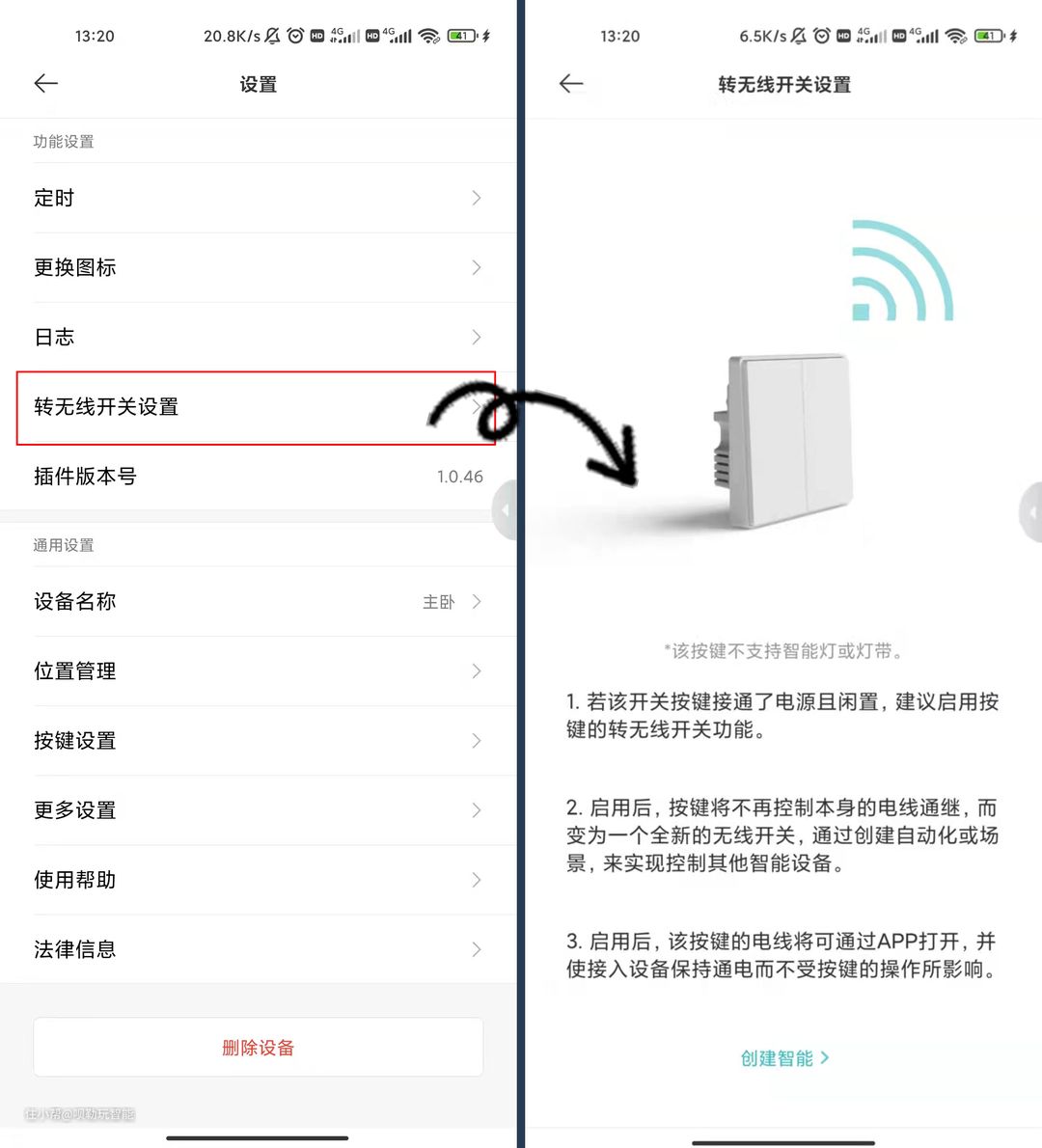 将实体按键转成无线后,设置智能场景与上方的方法相同,就可以实现互控了。