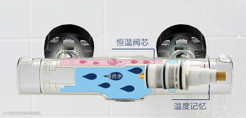 在冷热混水阀里有一个热敏原件,这种元件一般是由石蜡或者镍钛合金制成的,会根据温度的变化而改变自身的形状。