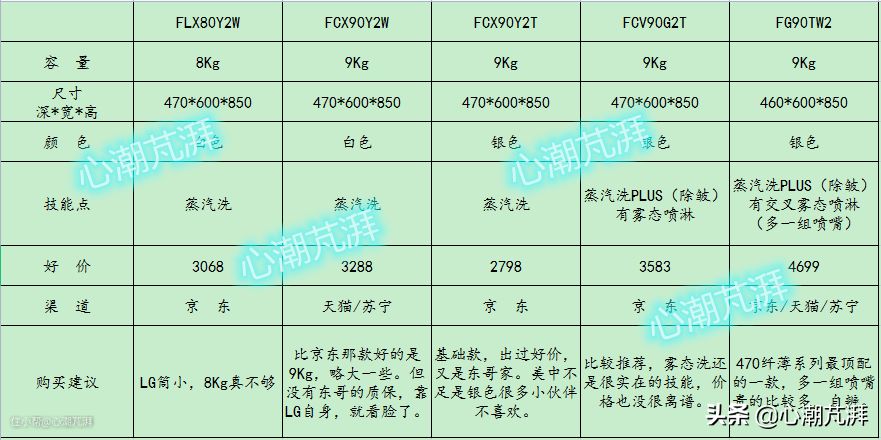 ▲这个价位470厚度的LG有好几款,简单做个表格大家看一下。LG经典白色的那款东哥家是8Kg的,加上LG本身筒就偏小,一般家庭不建议买。推荐的这款相比FCX90多了雾态洗(我的篇一介绍过),提高洗净效果的,在这个价位段这个技能点还是很实在的,不过相较顶配款的FG90的喷淋洗360°的要差,但那套太贵。。