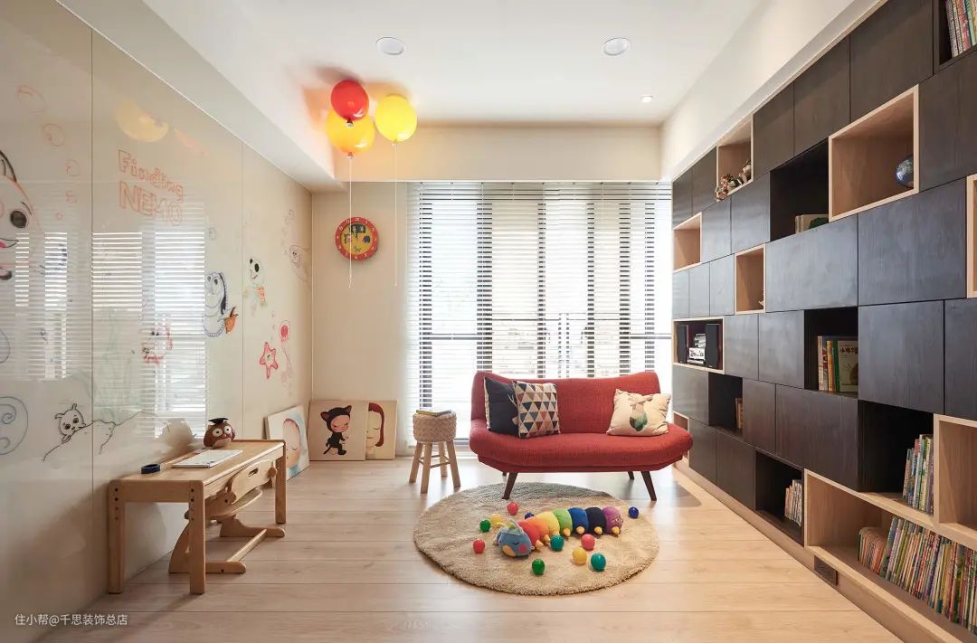有娃的父母肯定都希望有尽量多的时间陪伴在孩子身边,那不如就把客厅改造成用于亲子互动的休闲区吧,增进亲子关系妥妥的~