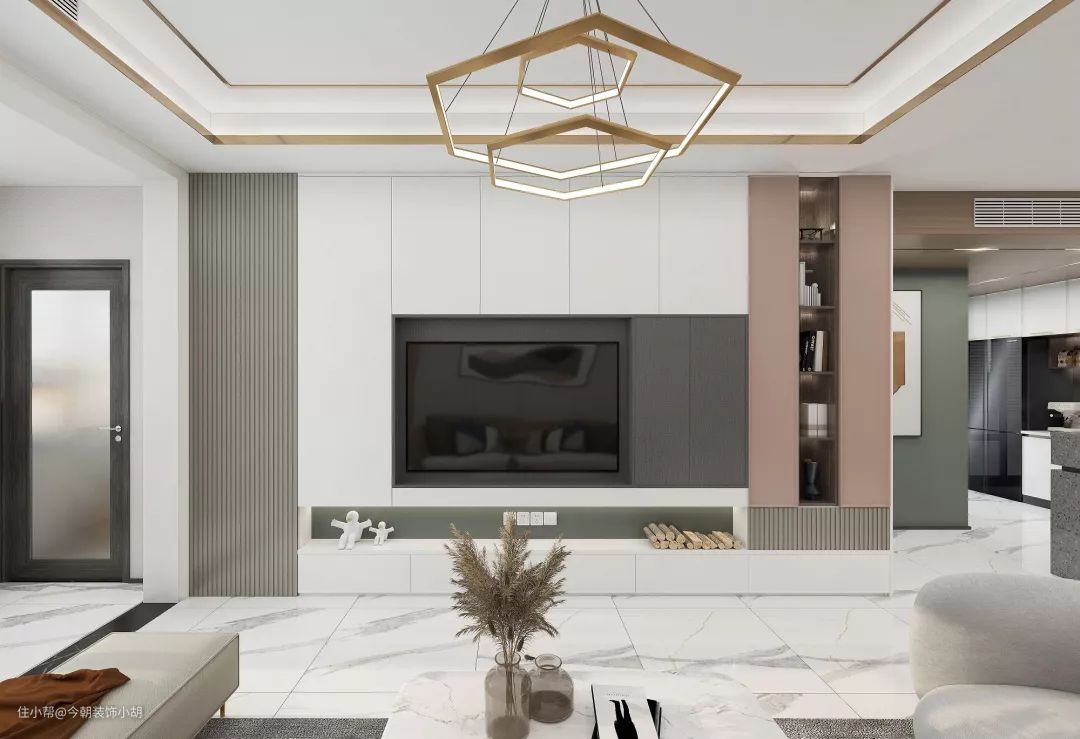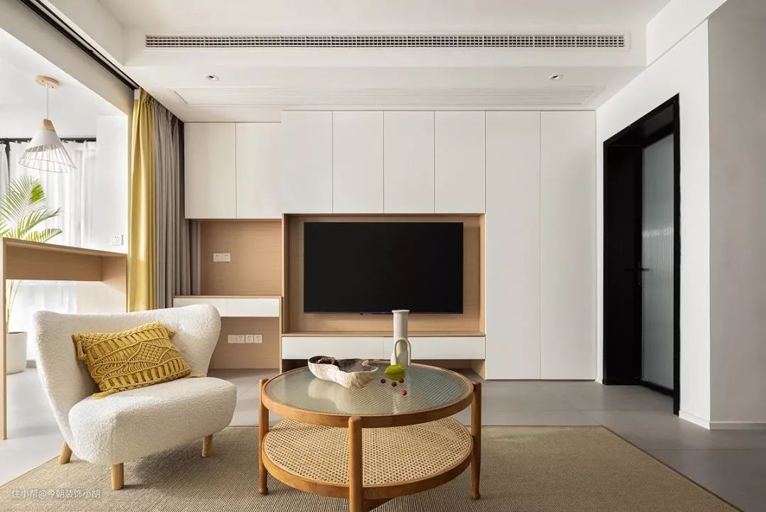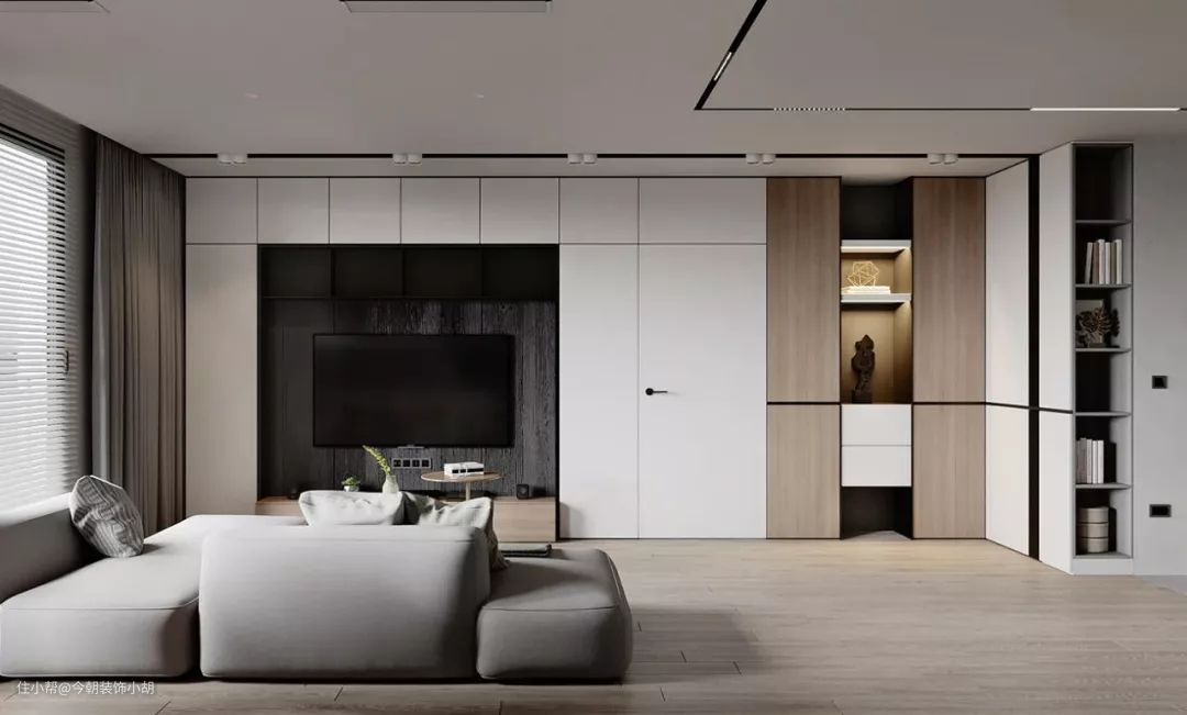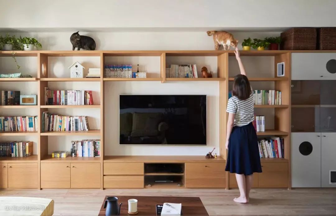 如果家里储物需求大,就做整墙电视柜!嵌入式的设计,柜体与墙融为一体,收纳空间满满,整齐大方、“治愈感”很强。