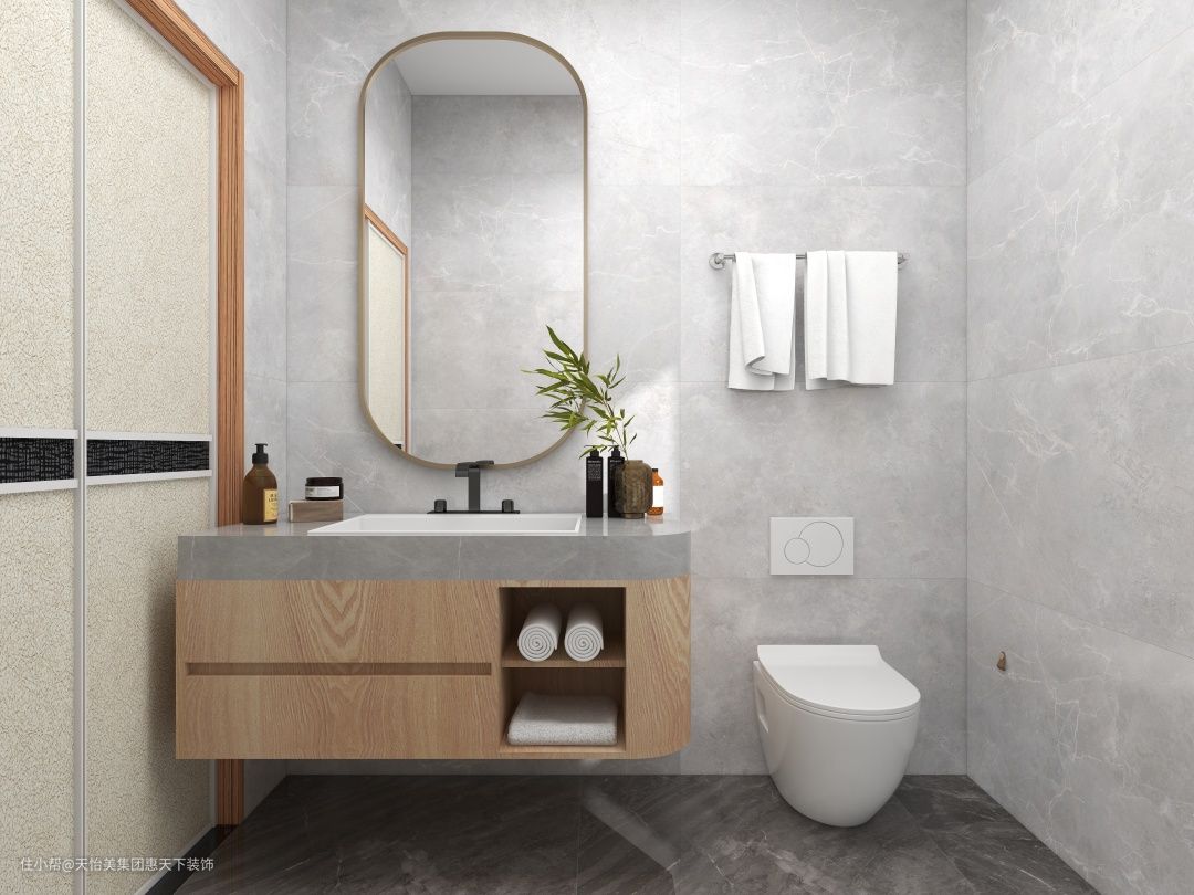 卫生间地面铺贴了深灰色的地砖,椭圆型镜子让卫生间空间多了一份精致性。