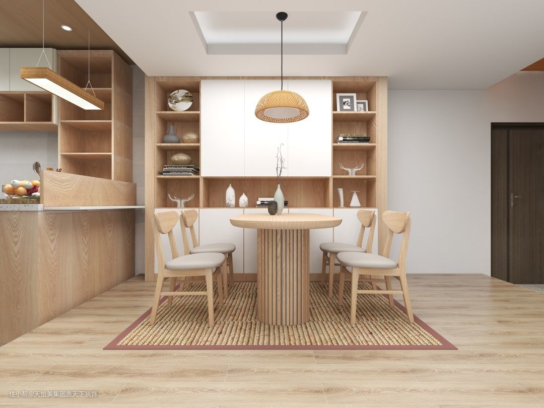 优雅原木系餐桌椅搭配色系相仿的地毯,呈现出满满的温馨舒适感。餐厅一侧搭配一个多功能定制柜,材质与地面餐桌相仿,保持全屋色调的统一性。