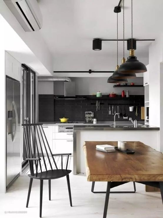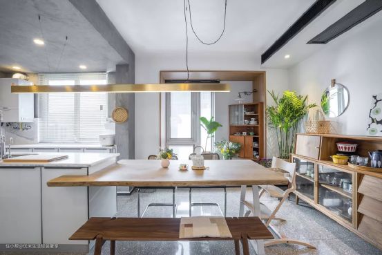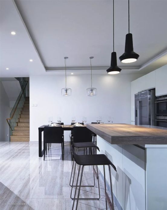 如果厨房和餐厅空间都比较小,我们就可以把厨房餐厅打通,让它们融为一体,中岛与餐桌的结合更加拓宽了餐厨的功能性。中岛高度通常是850-900mm,而餐桌高度是700-750mm,所以按照正常餐桌设计的话,岛台与餐桌之间会有一个高低差的。