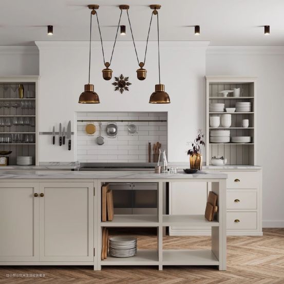 中岛台不仅有扩充的操作台面,还有下方不能忽视的收纳空间。可以做成柜子、抽屉或者开放的储物格,中岛上方也不会浪费,还可以增加悬挂式的收纳架,放一些植物装饰、挂上酒杯,相当有格调。