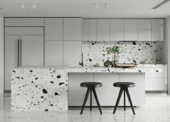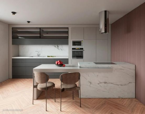 中岛与餐桌一体式设计大气时尚,非常适合现代风格家庭。可以选择同材质拼接,也可以用不同材质进行拼接。