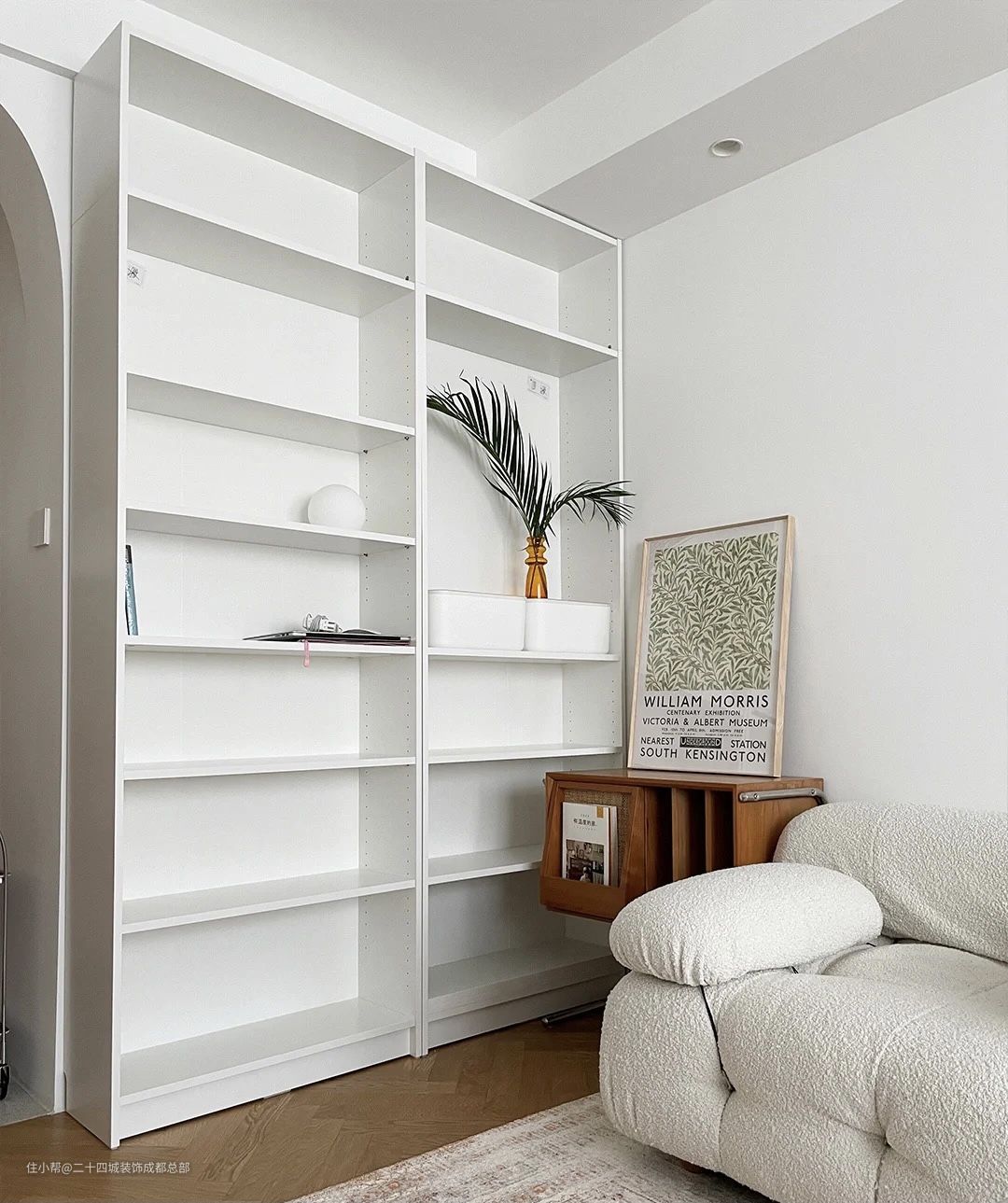 白色的开放式书柜代替了电视柜,既可以收纳书籍,又能摆放各种小物件,美观又实用。