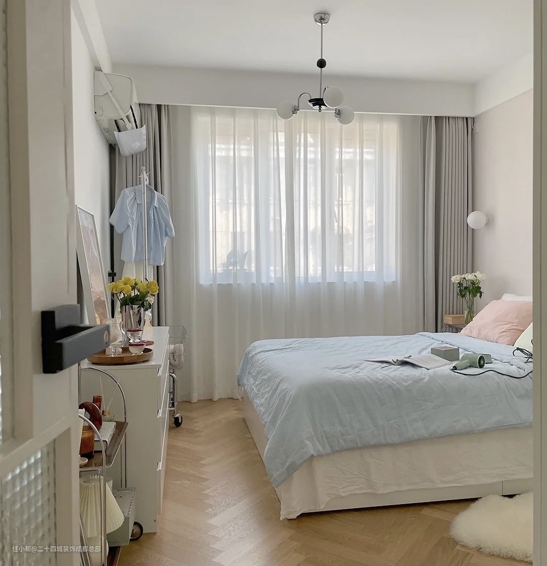 主卧的背景墙刷的是白骆驼色系有点偏粉色,其他都是大白墙,地面是人字拼的地板,