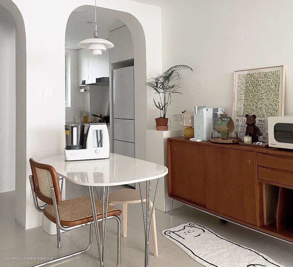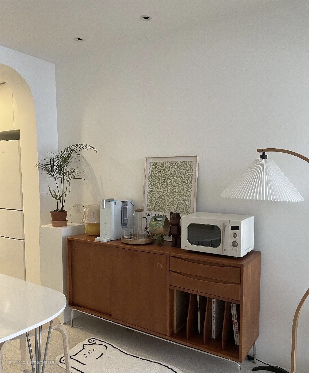 靠墙的位置放了一个中古风的餐边柜,同时也是一个小水吧,台面上放了净水机和杯子,柜子里收纳日常泡茶的东西,用起来很顺手。