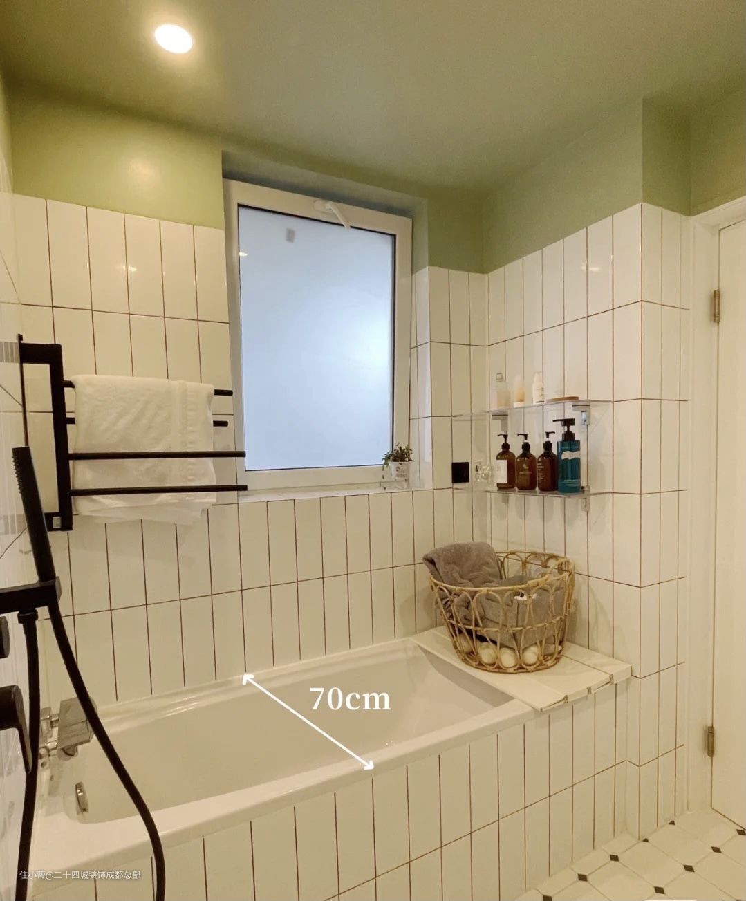 湿区与干区颜色呼应,绿色与白色为主色,正对门的墙上装了入墙式的花洒。