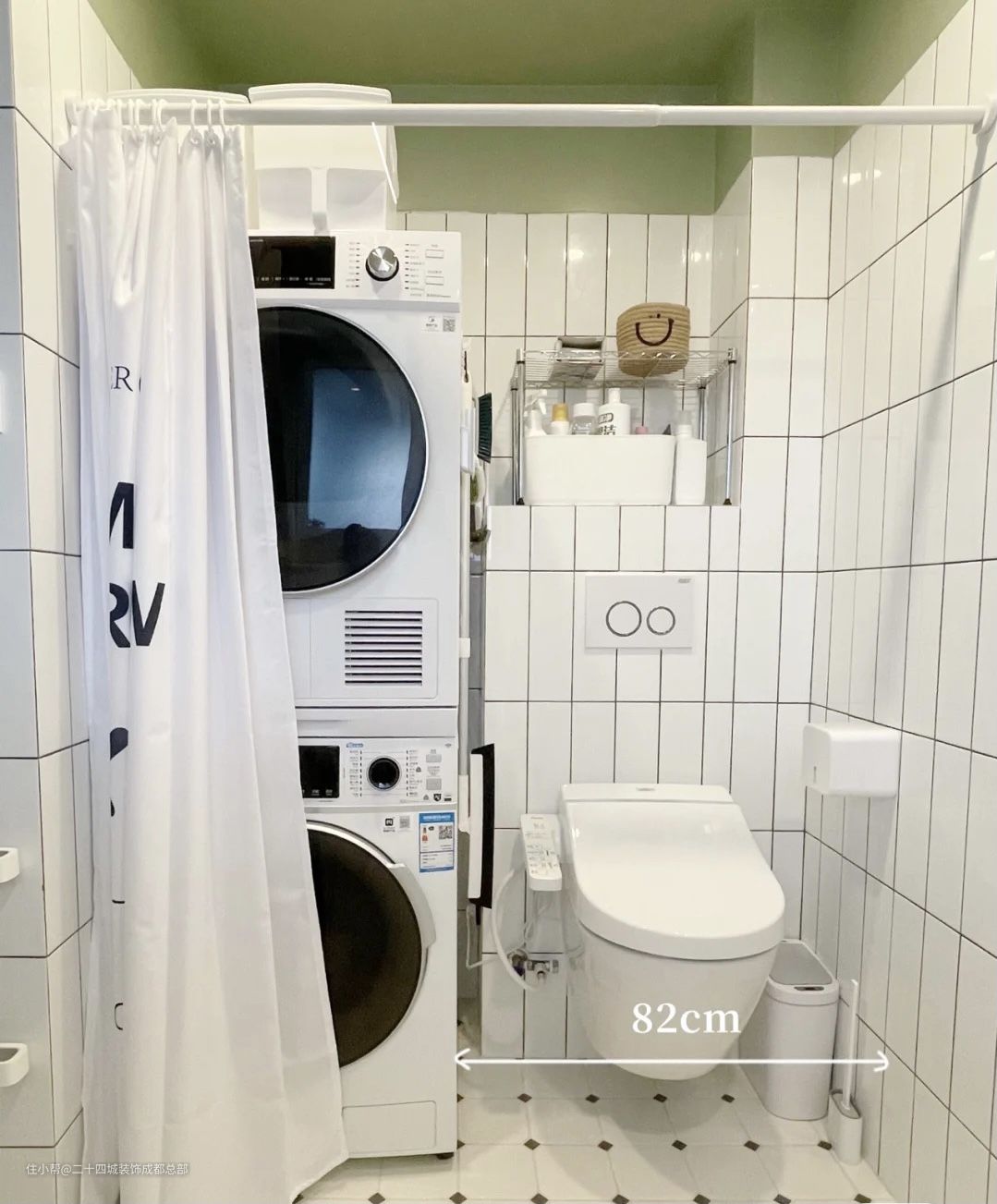 左侧是洗衣区和马桶,安装了浴帘将左边的洗衣区、马桶与右边的淋浴区、泡澡区分区。