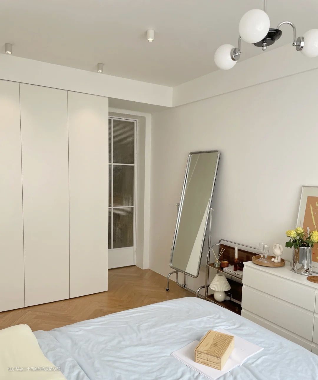 因为房间偏长,便设计定制了L型的顶天立地柜,收纳能力直接满分,柜门无把手设计,简单干净,柜门使用了反弹器,一按柜门就开了,很简捷方便,旁边配备了穿衣镜,为女主提供方便快捷的镜像穿搭,底部是有轮滑的,移动非常方便。