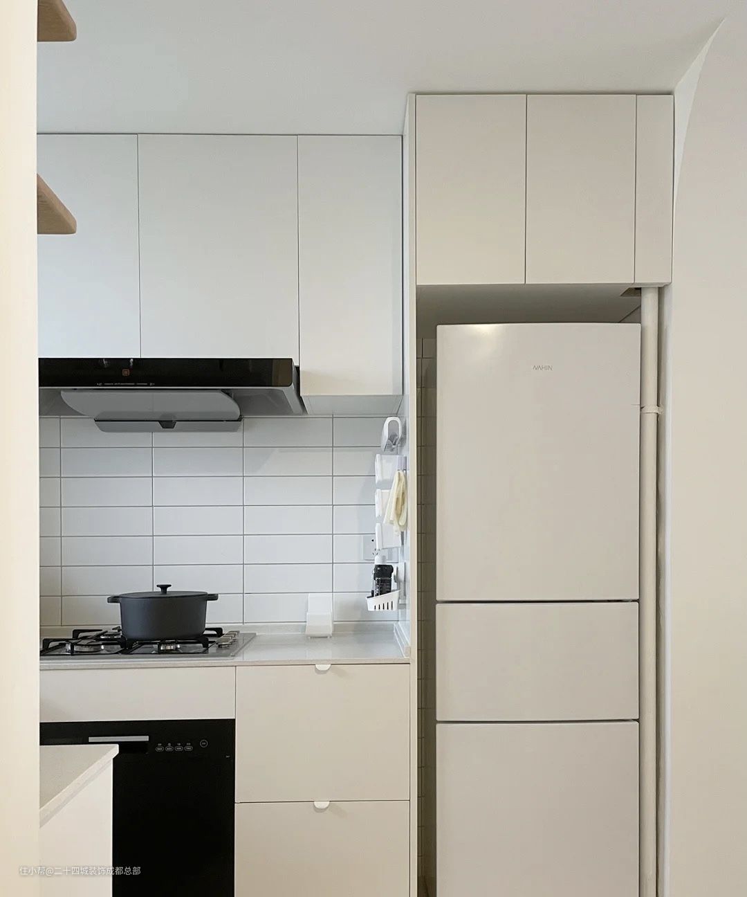 灶台旁定制了顶天立地柜,预留了冰箱的位置,柜体侧面设计了收纳盒,增加厨房的收纳空间。