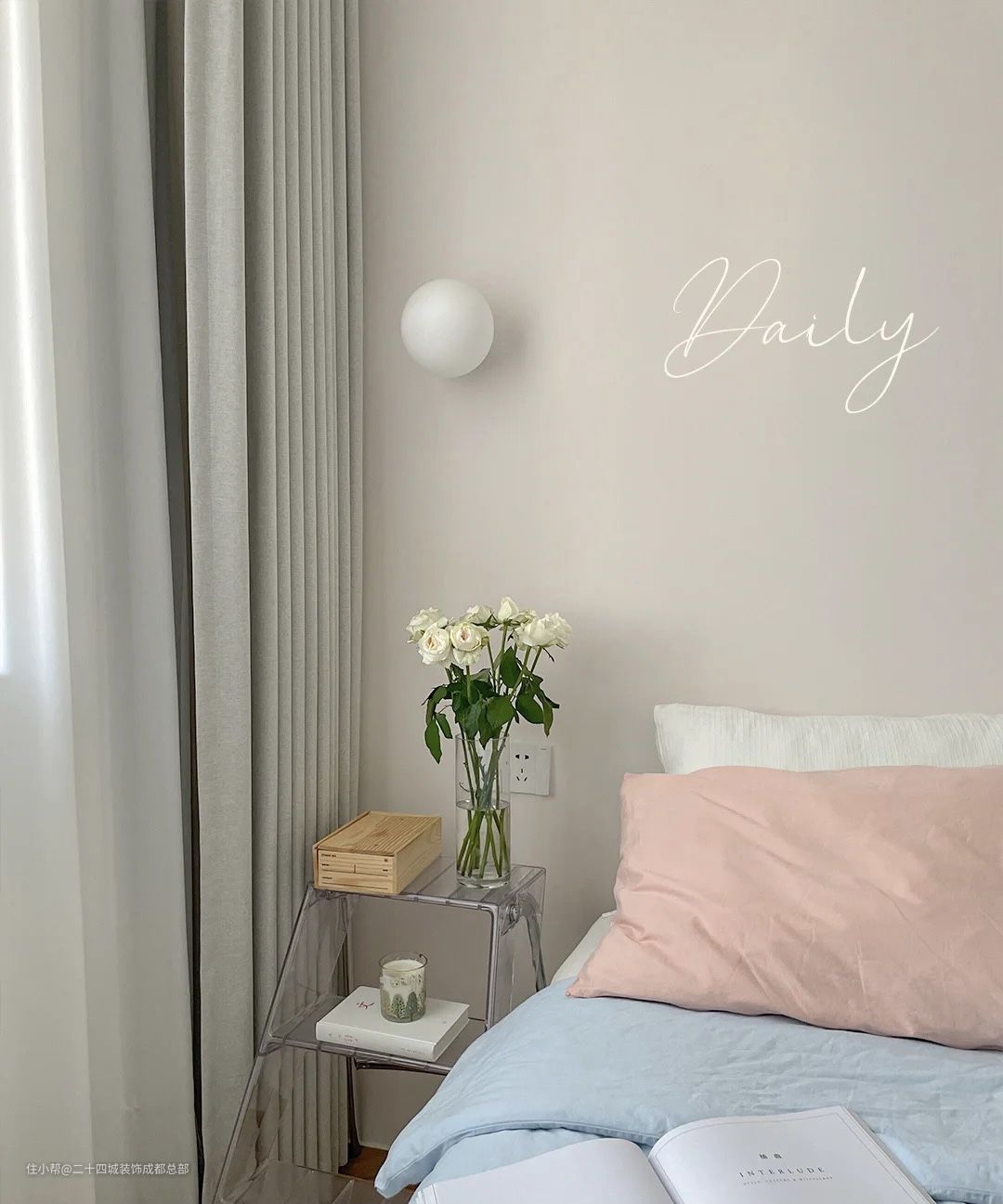 左边是一个三层透明置物架,充电插孔也在这边,第一层放置了花束,为空间增添浪漫气息;第二层放置了睡前书籍,手机充电时也可以放在此处;第三层可以防止居家的拖鞋,方便换穿。