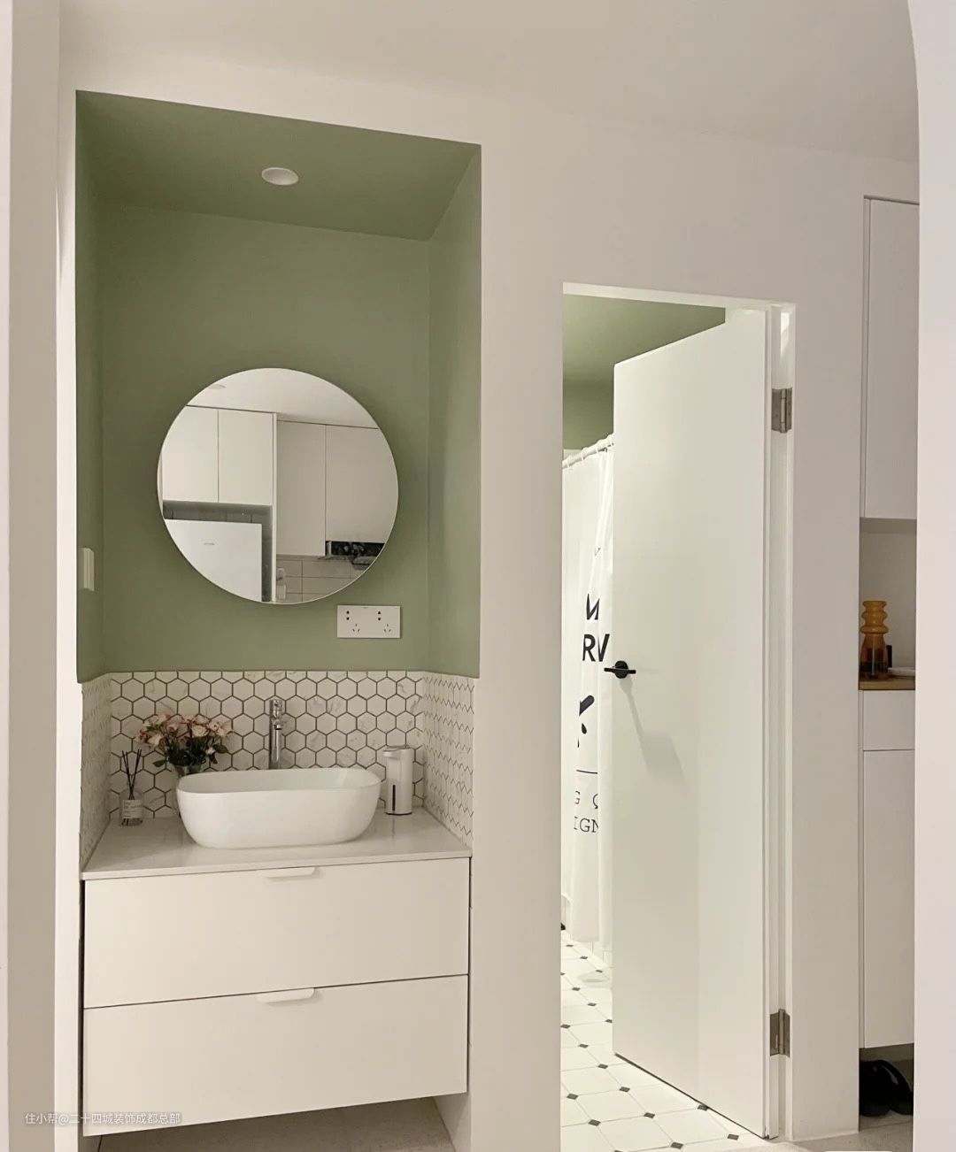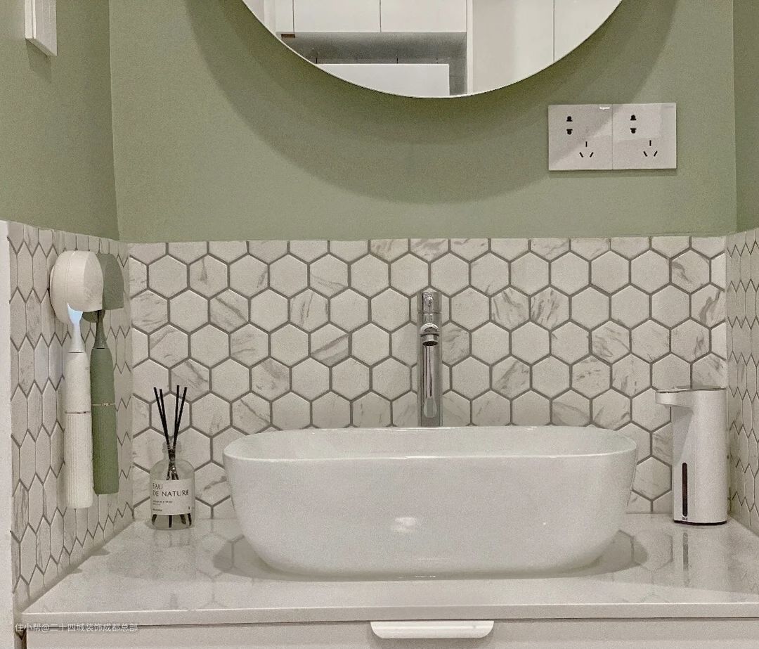 卫生间做了干湿分离设计,干区洗手台的设计很简单,色系主要是绿色和白色,银色是辅助色,白色马赛克瓷砖搭配浅灰色的美缝,防水漆直接刷在瓷砖顶面,没有使用金属腰封条,更简洁,整体看起来干净清爽。