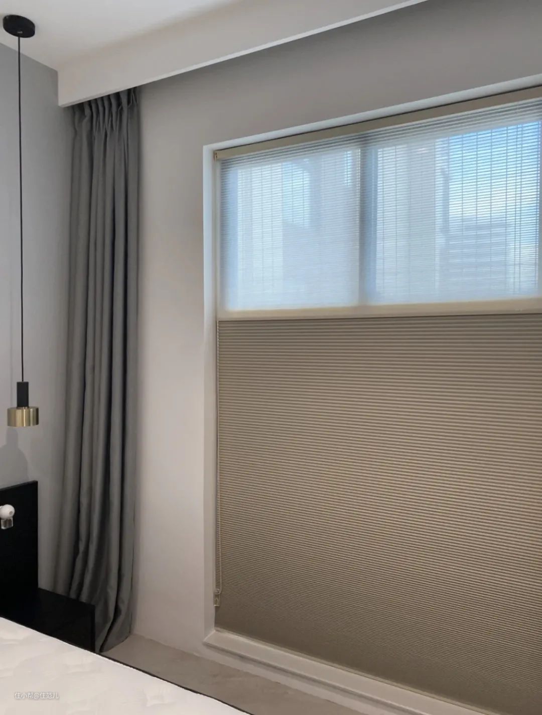 蜂巢帘还有一种日夜组合版,上层是白色柔纱,下层是全遮光无纺布。