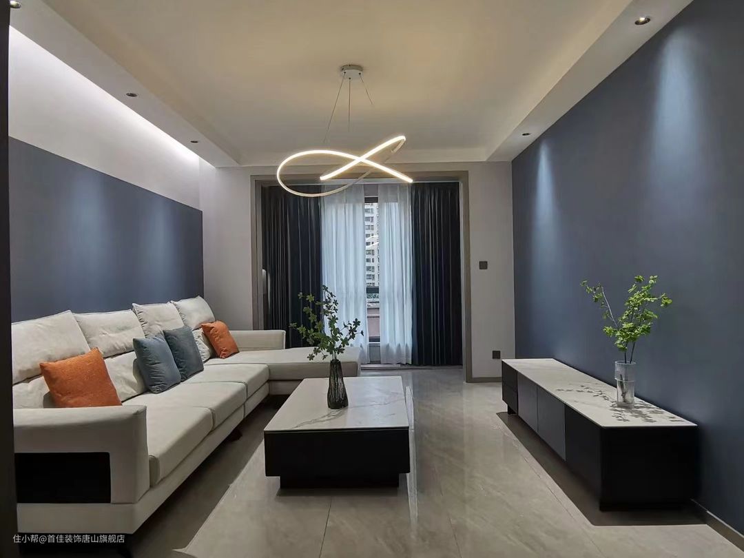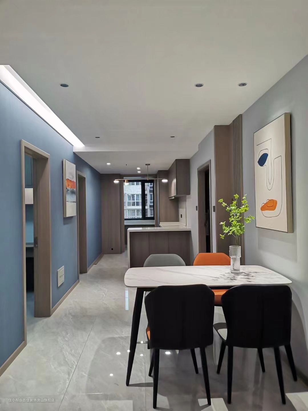 从颜色的设计上就能感受到客厅与餐厅带给我们一种温馨感。蓝白色的背景墙设计让整体显得非常时尚潮流,一个白色沙发让整体倍感温馨。