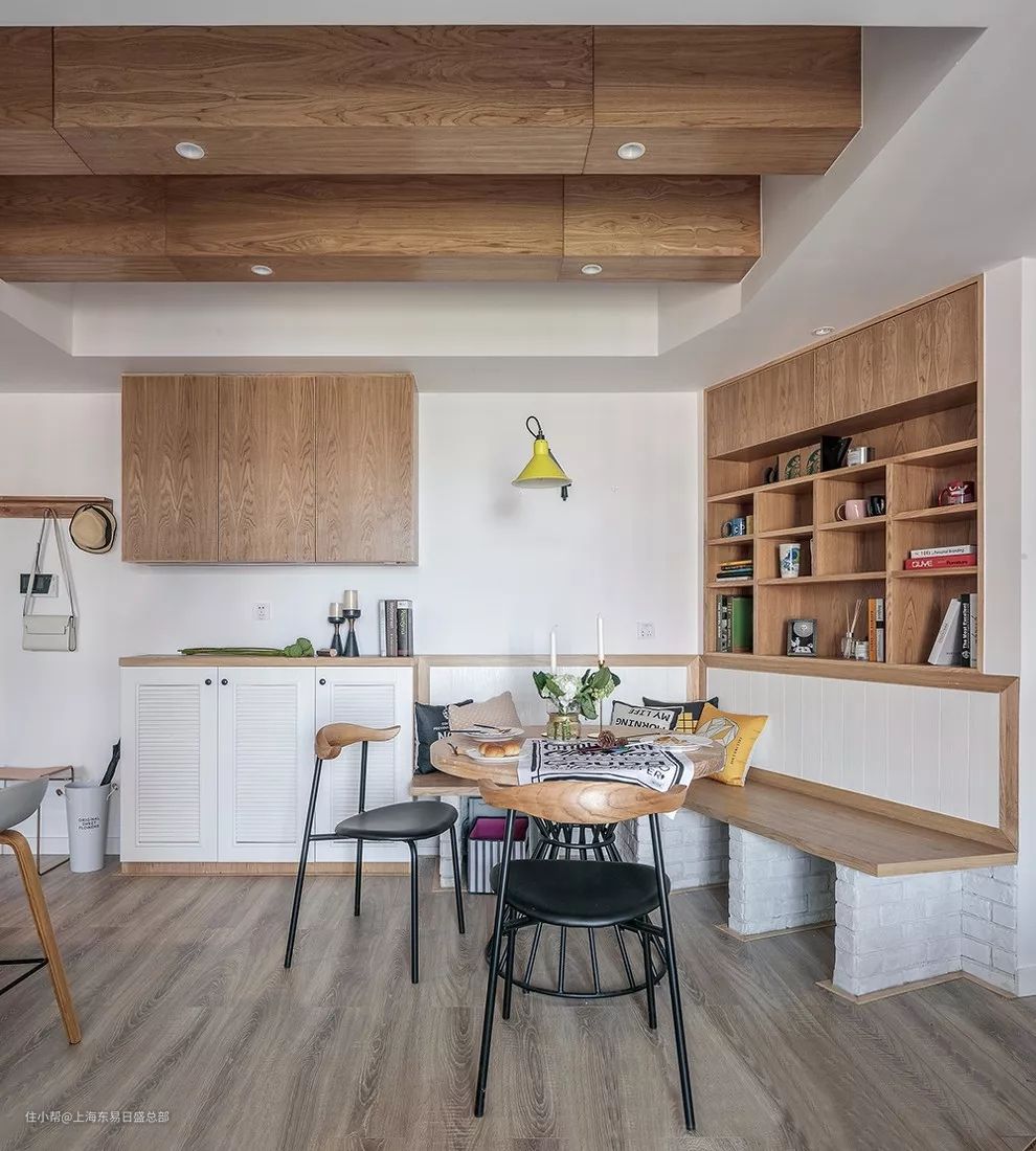 折角的餐厅充分利用了角落的空间, 圆形的餐桌也留出了足够的走廊过道。卡座的背后还做了嵌入式的柜子,满足餐厅的收纳需求
