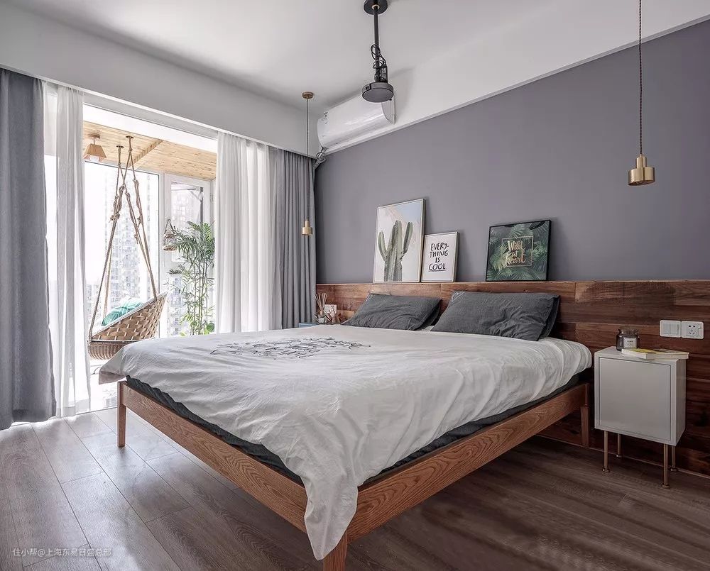 主卧室外的阳台被包了进来,做上一个舒适的摇椅。灰色调的背景墙搭配木质的护墙板,点缀几幅绿植装饰画显得更为自然、清新
