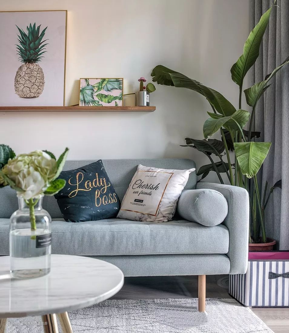 在客厅内也不缺少绿植元素,角落里的大绿植搭配背景墙上的绿植装饰画。舒适的布艺沙发底部是木质脚,茶几选择了大理石桌面和金属脚,优雅而又大方