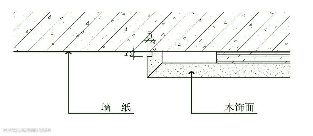 木饰面顶端预留5mm*10mm工艺缝,顶部工艺缝不易过小,否则会影响后期油漆工找补,可根据顶面高度适当调整,使用常规60°视角墙顶面交界线能够弱化瑕疵效果。也可以根据设计尺寸预留,定制成品石膏线或者成品金属收口条。