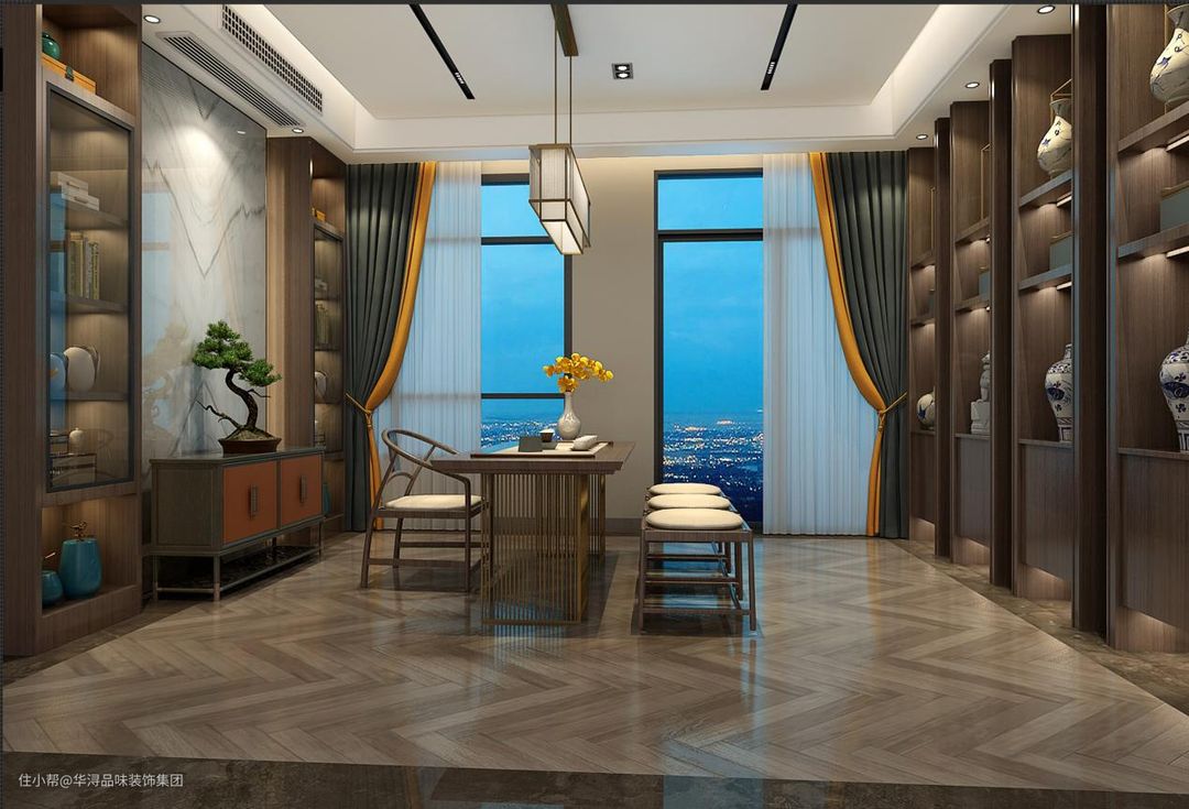 设计师单独拿出了一个房间做成了书房,房间的主灯选用了一款中国风的样式,整个房间采用对称结构,正对面是一组大型落地窗,看书学习之余可以在这里远眺窗外的风景, 放松自己的眼睛。