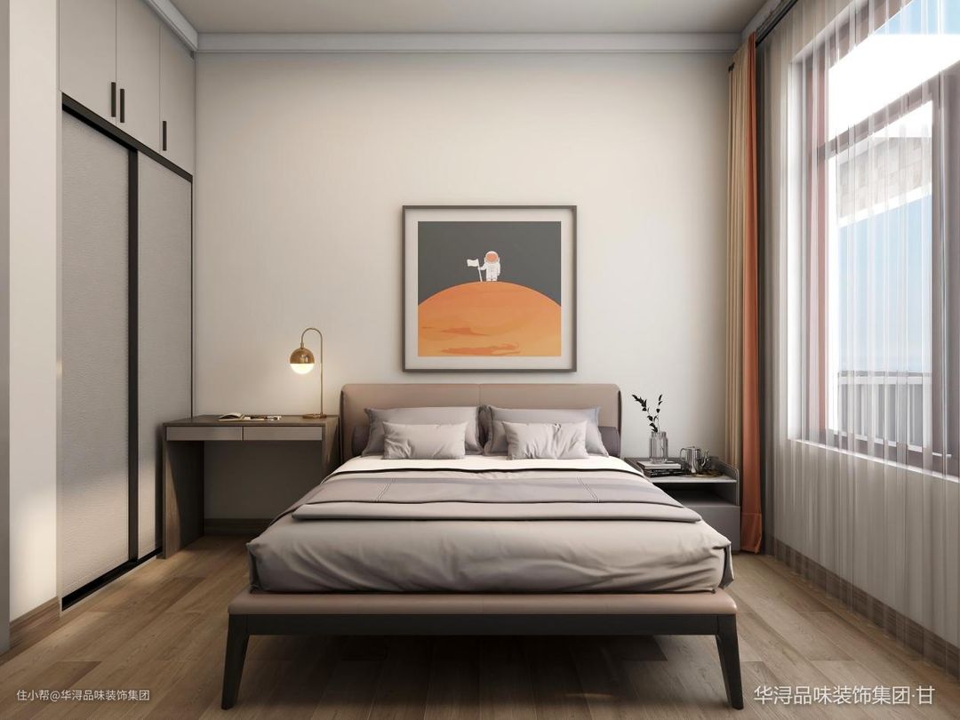 次卧是年轻人居住,子女的房间设计的当然要活泼、年轻化一点。床体选用了一款较为简单时尚的样式,浅棕色的色调也能让人更有睡意,白色的床头背景墙中间悬挂了一幅正方形的现代画,这是一幅宇航员登月的画面,橘红色的色调也看起来更加美观大方。