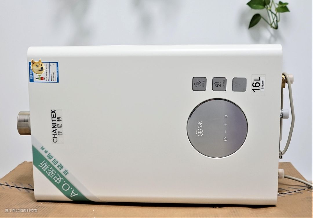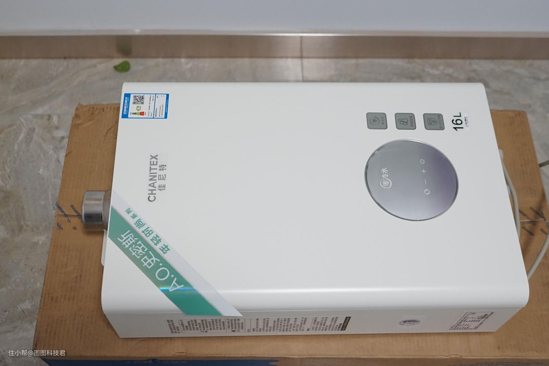 打开包装,我们可以看到热水器正面是他的logo,正下方是操作区域,在操作区域的右侧,从上到下四张贴纸,分别是:零冷水、舒适恒温、抗-20度严寒、16L大容量,还在为这些问题担心吗?加尼特帮你解决了。右上角有能效标识。
