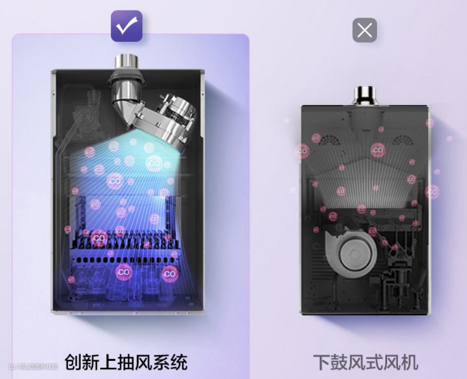 背部是进风空,同时也采用了创新向上抽风燃烧系统,相比鱼传统的下鼓风式风机来说可以有效的隔离外部的空气,避免供气因为气流波动而造成热水忽冷忽热,在加上机器的全自动调节,精准燃烧,全程恒温使用。